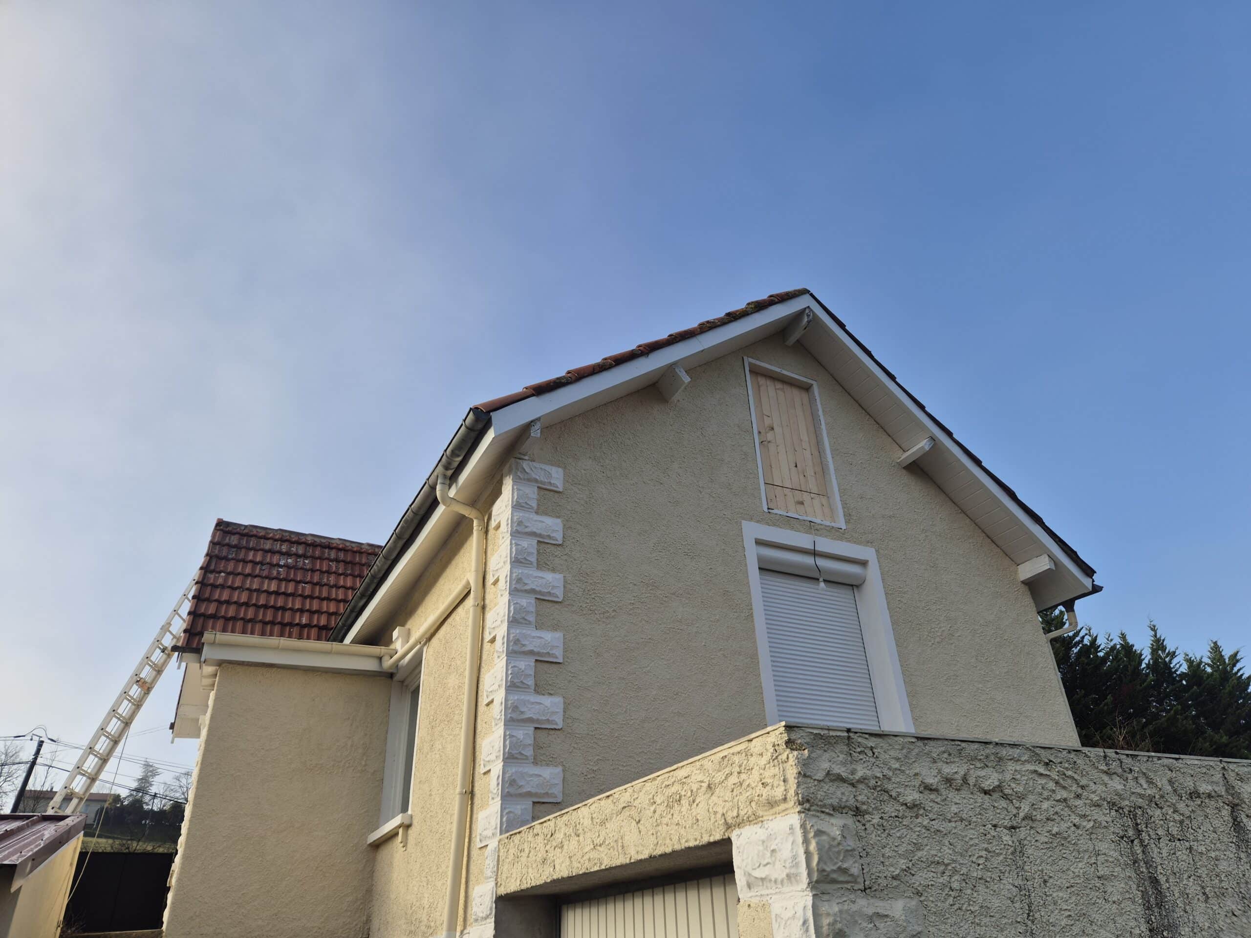 Le client m'a sollicité pour une rénovation complète : toiture, peinture façade et recouvrement avant-toit PVC à Mirande. Sur place, l'état initial révélait une toiture à deux pentes avec des tuiles traditionnelles en terre cuite… attaquées par les mousses et lichens. L'enduit de façade montrait des signes d'érosion, et les éléments de gouttières nécessitaient une vérification approfondie.